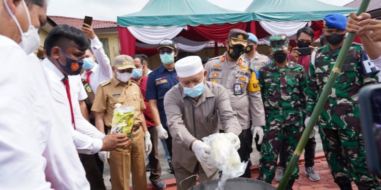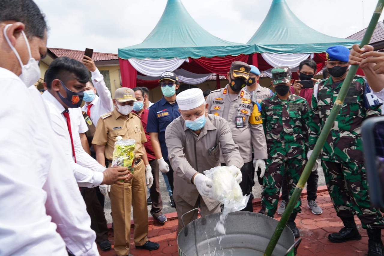TASLABNEWS, ASAHAN -Kapolres Asahan AKBP Putu Yudha Prawira SIK MH bersama Forkopimda Asahan menggelar pemusnahan barang bukti sebanyak 62,797 kilogram sabu yang di gelar di depan lapangan apel Mapolres Asahan, Senin (15/11/2021) siang.