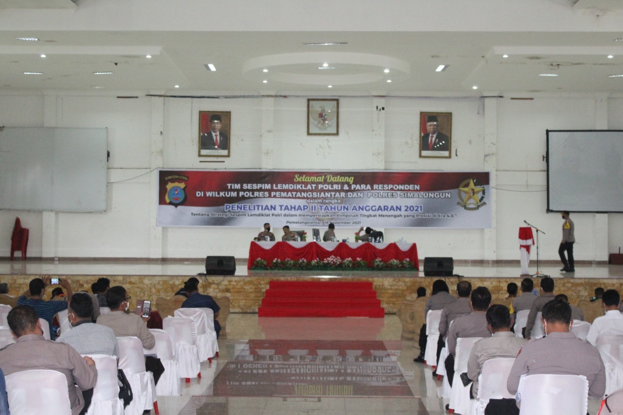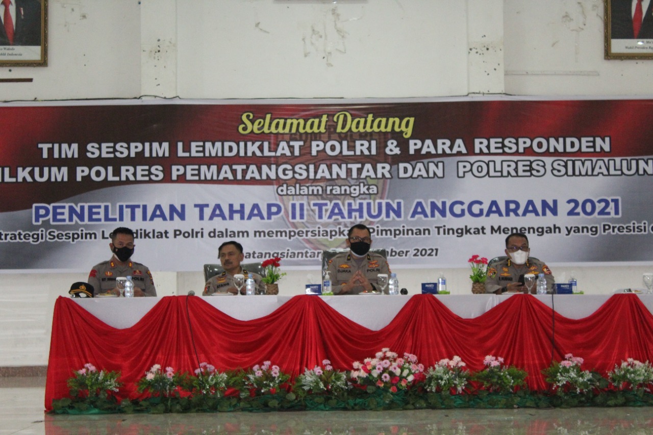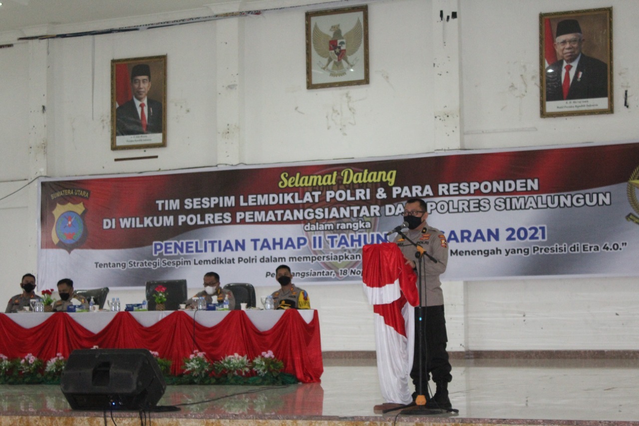 Dalam sambutan, Kapolres Pematangsiantar menyampaikan, selamat datang kepada tim dari Lemdiklat Polri untuk melaksanakan tugas di wilayah hukum polres pematangsiantar dalam melaksanakan penelitian tahap II Tahun 2021, dengan tema Strategi Sespim Lemdiklat Polri dalam mempersiapkan Pimpinan Tingkat Menengah yang Presisi Di Era 4.0.