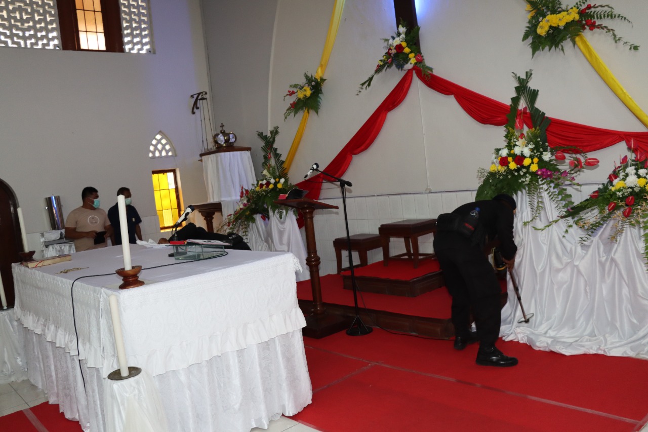 Lanjut Kasubbag Humas Polres Pematangsiantar, sterilisasi dilakukan Personel dengan menggunakan alat pendeteksi bom, baik di dalam bangunan gereja maupun di halaman gereja.