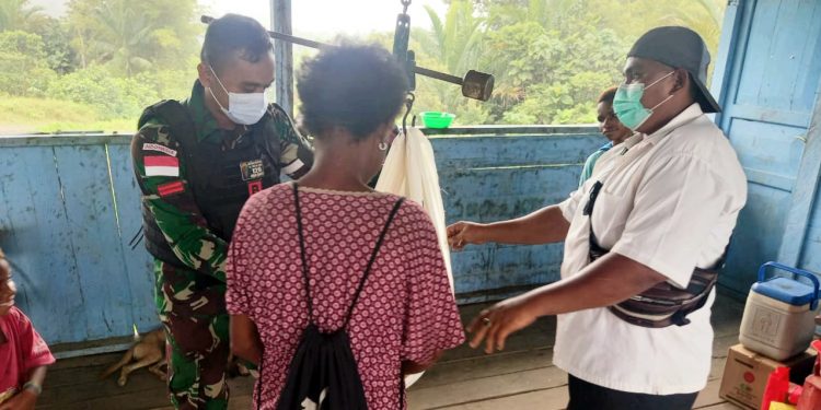 TASLABNEWS, PAPUA – Bekerjasama dengan Puskesmas Towe Hitam, Prajurit Satgas Pamtas RI-PNG Yonif 126/KC memberikan pelayanan kesehatan Posyandu kepada anak-anak dan Balita perbatasan Papua, tepatnya di Kampung Towe Hitam, Distrik Towe, Kabupaten Keerom, Provinsi Papua