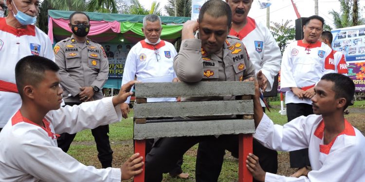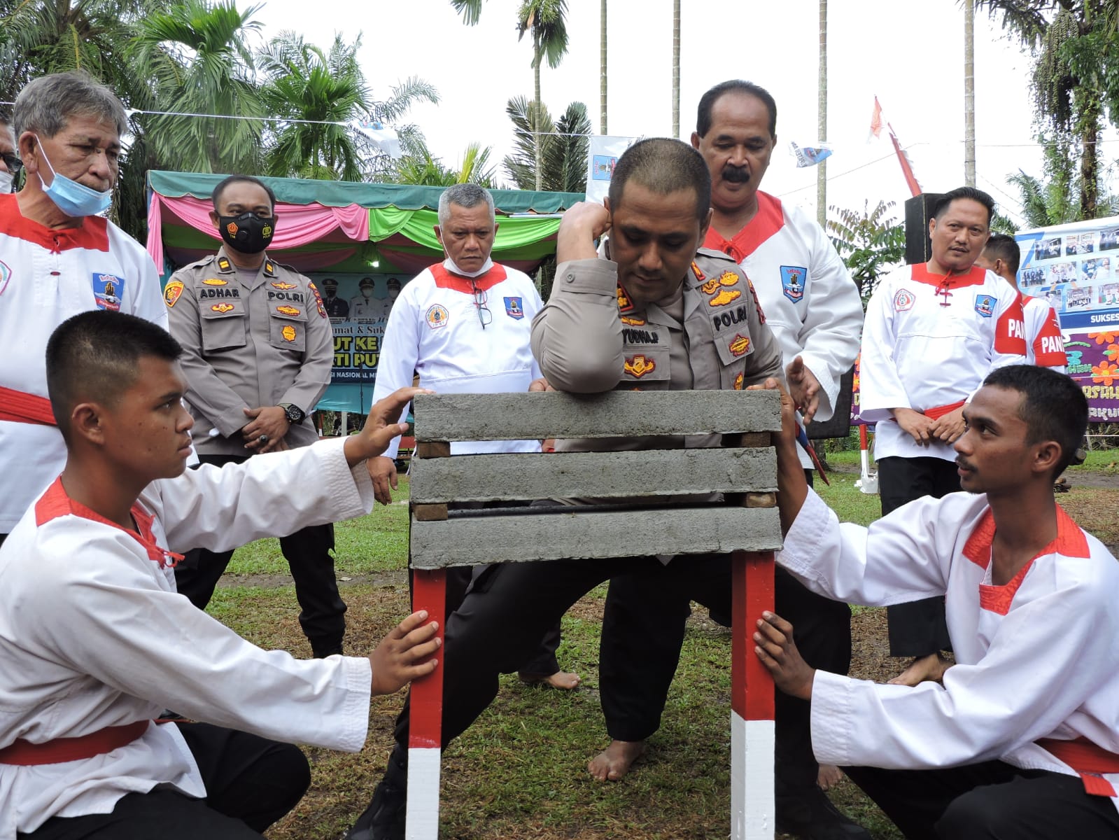 TASLABNEWS, ASAHAN-Kapolres Asahan AKBP Putu Yudha Prawira SIK MH melakukan atraksi berupa memecahkan batu batako dengan menggunakan lengan kanan yang juga diikuti personil Sat Intelkam Polres Asahan dan Anggota Merpati Putih