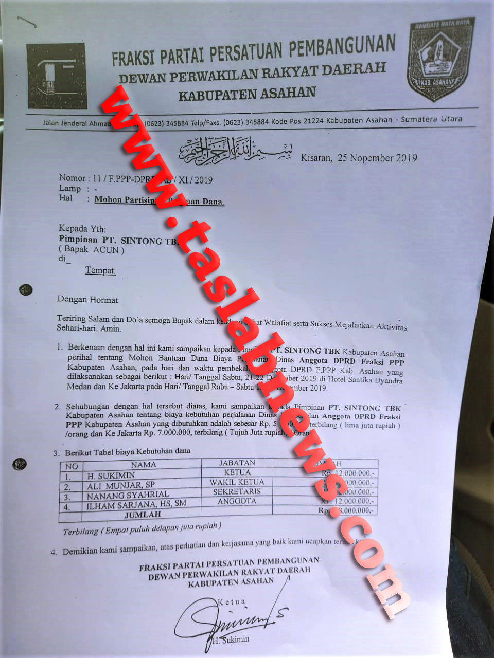 Diterangkan pria yang biasa dipanggil Aan tersebut, para Anggota DPRD Fraksi PPP meminta bantuan biaya perjalanan dinas untuk kegiatan pembekalan di Medan dan di Jakarta kepada PT Sintong TBk pada bulan Nopember 2019 lalu.