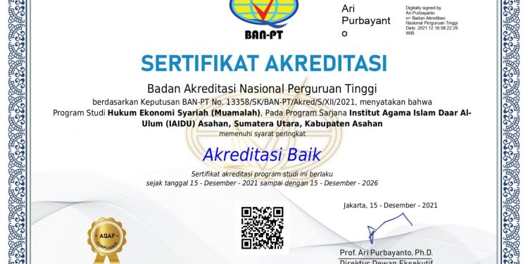 TASLABNEWS, ASAHAN – Program Studi (Prodi) Hukum EKonomi Syariah (HES) Fakultas Syariah Institut Agama Islam Daar Al Uluum (IAIDU) Asahan memperoleh kado dari Badan Akreditasi Nasional Perguruan Tinggi (BAN-PT). Prodi tersebut berhasil meraih akreditasi Baik.