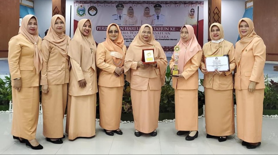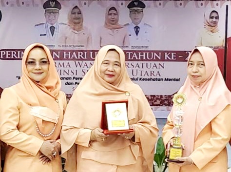 TASLABNEWS, ASAHAN – Ketua Dharma Wanita Persatuan Kabupaten Asahan, Hj Derlina John Hardi Nasution menerima penghargaan terbaik pertama kategori Keaktifan dan Pelaporan Elektronik Pelaksanaan Program Kerja (E-Reporting) Dharma Wanita Persatuan (DWP) se-Sumatera Utara bertempat di Aula Dinas Perhubungan Provinsi Sumatera Utara, Sabtu (18/12/2021).