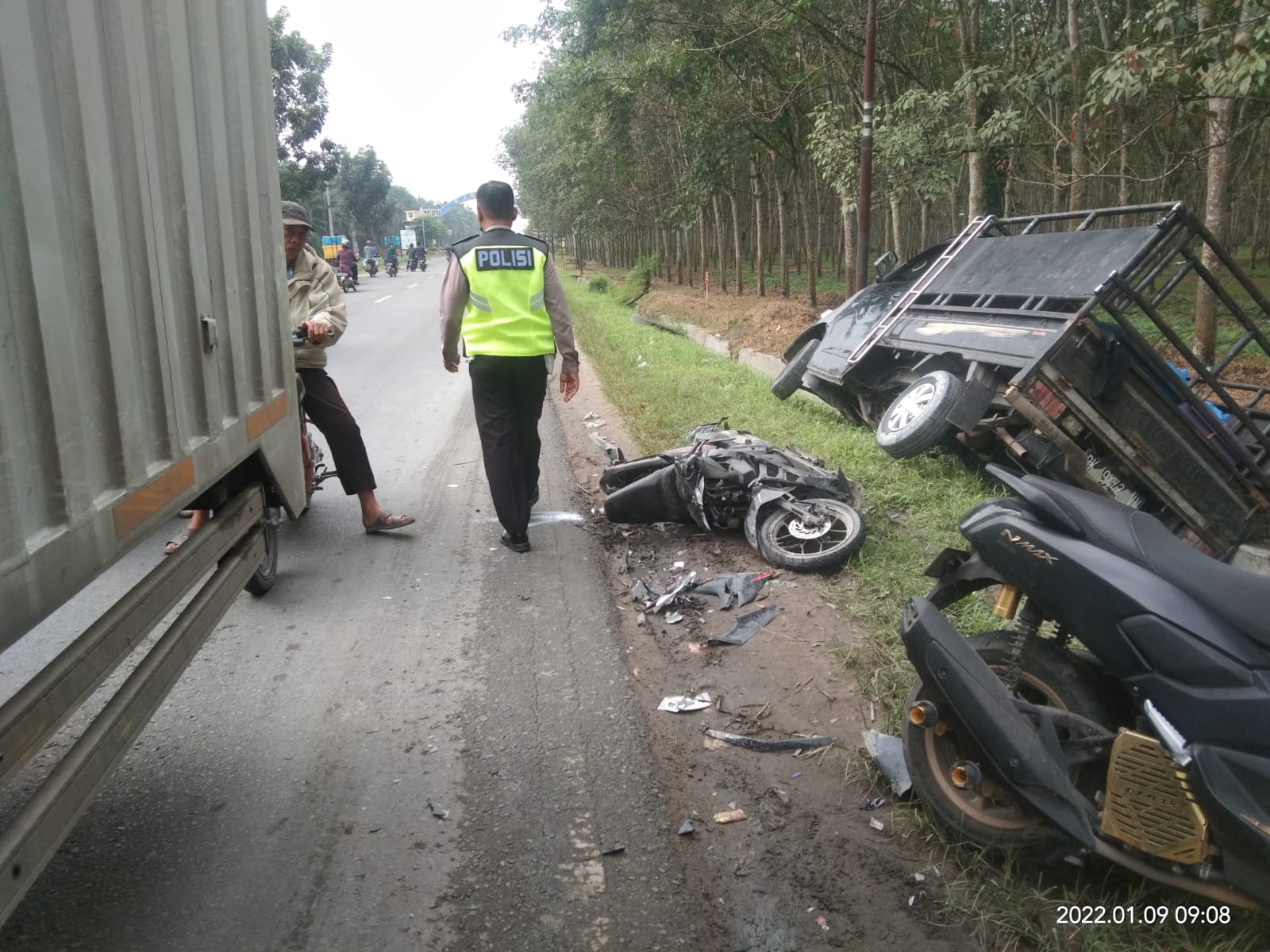 Tepat di TKP tepatnya di Jalinsum Desa Pulau Bandreng tepatnya di dekat pintu gerbang selamat datang di Kota Kisaran, tiba-tiba kretanya (sepedamotor) jatuh dan orangnya tercampak ke arah parit. Akhirnya aku tabrak hingga sepedamotornya terseret sekitar 40 meter. Sementara korban hanya mengalami luka ringan dan langsung di bawa ke rumah sakit,” jelas Sarel.