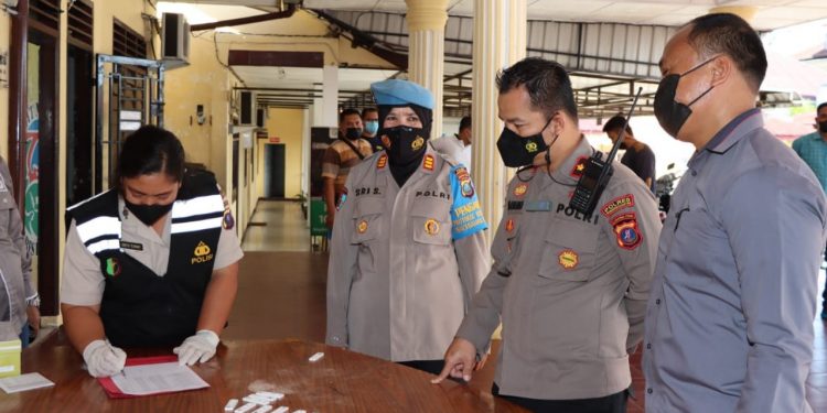 TASLABNEWS, PEMATANGSIANTAR – Untuk mengantisipasi terlibat penggunaan narkoba, Personil Polres Pematangsiantar menjalani tes urine mendadak di depan Sat Narkoba Polres Pematangsiantar, Jumat (7/1/2022) pukul 08.30 WIB.