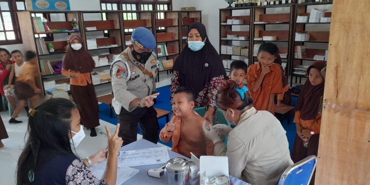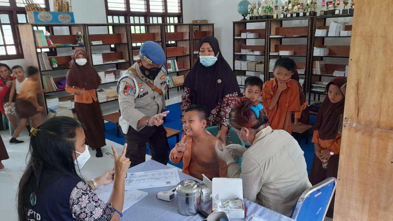 TASLABNEWS, ASAHAN-Sebanyak 18 murid divaksin saat pihak personel Polsek Bandar Pasir Mandoge, Polres Asahan melaksanakan vaksinasi susulan Dosis I dan II jenis vaksin Sinovac untuk anak usia 6 sampai 11 Tahun, Sabtu (12/2/2022).