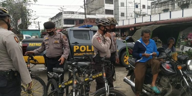 Selain berpatroli bersepeda, pihaknya juga berkoordinasi dengan pengelola pasar untuk menerapkan protokol kesehatan di pasar guna mencegah penyebaran Covid 19.