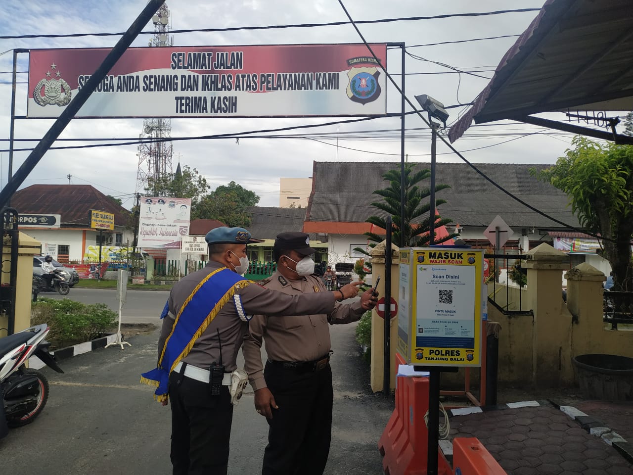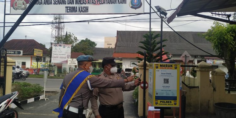 “Setiap mau masuk ke Markas Komando (Mako) Polres Tanjungbalai harus melalui Scanning QR Barcode Aplikasi Peduli Lindungi dan Pelaksanaan Kegiatan Cuci Tangan, Pengukuran Suhu Tubuh serta Penerapan Protokol Kesehatan. Ketentuan ini berlaku bagi seluruh anggota Polri, ASN dan pengunjung Polres Tanjungbalai.