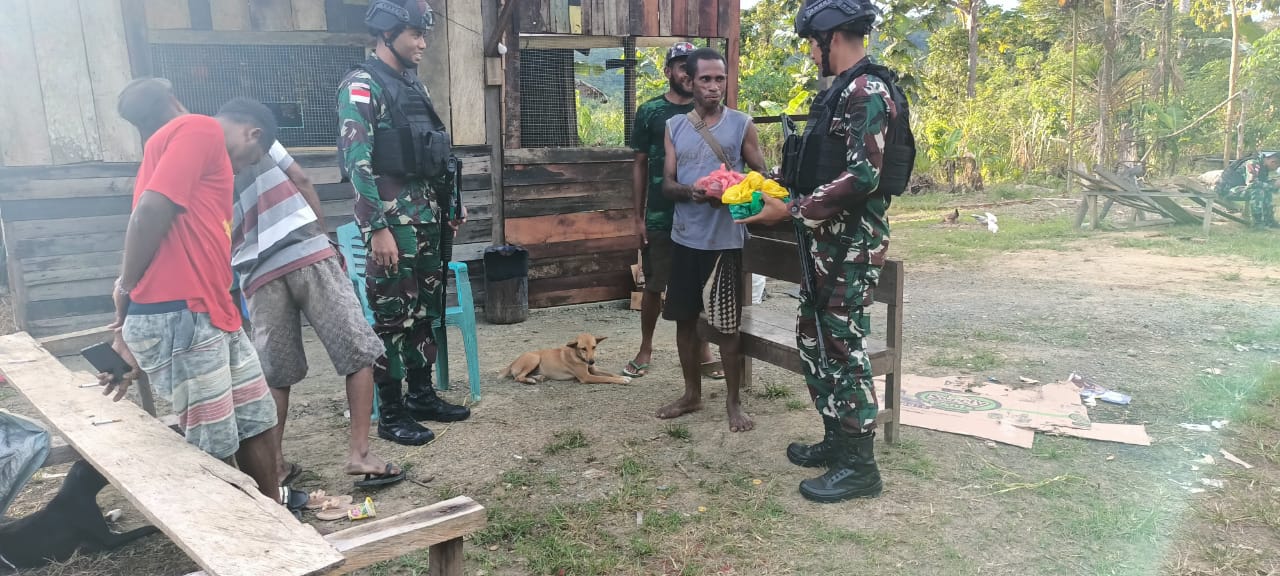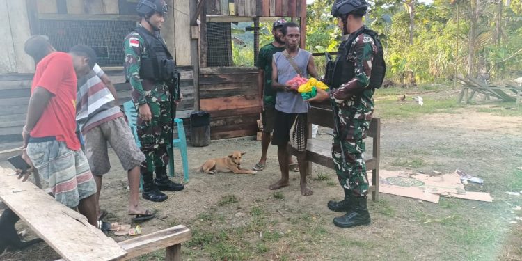 TASLABNEWS – Pos Kalimao yang dipipimpin Dankipur IV Satgas Pamtas RI-PNG Yonif 126/KC Asahan Lettu Inf Tomi Marcelino Jostenz berbagi sosial menyalurkan sembako kepada warga perbatasan di kampung Kalimao, Kabupaten Keerom.