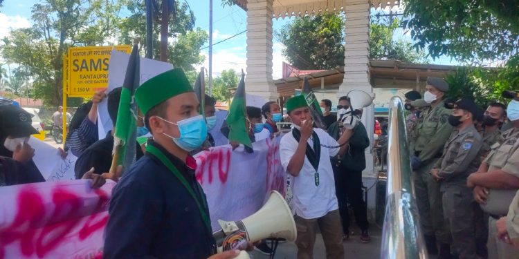 TASLABNEWS.COM, LABUHANBATU – Puluhan Mahasiswa yang tergabung dalam Himpunan Mahasiswa Islam (HMI) Cabang Labuhanbatu Raya, berunjukrasa di depan Kantor Bupati Labuhanbatu setempat, Rabu (02/03/2022) pagi.