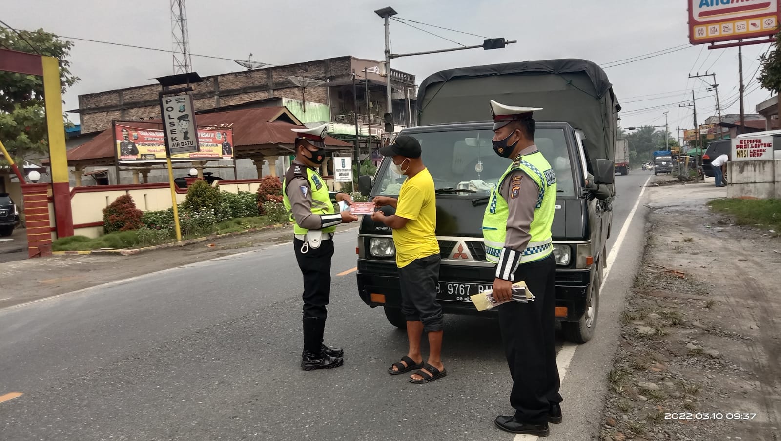 TASLABNEWS, ASAHAN-Kapolsek Air Batu AKP Rusli Damanik bersama anggota mengadakan OPS keselamatan Toba 2022 di jalan depan Polsek Air Batu sekaligus membagikan masker pada warga, Jumat (11/03/2022) sekira pukul 11.00 wib.