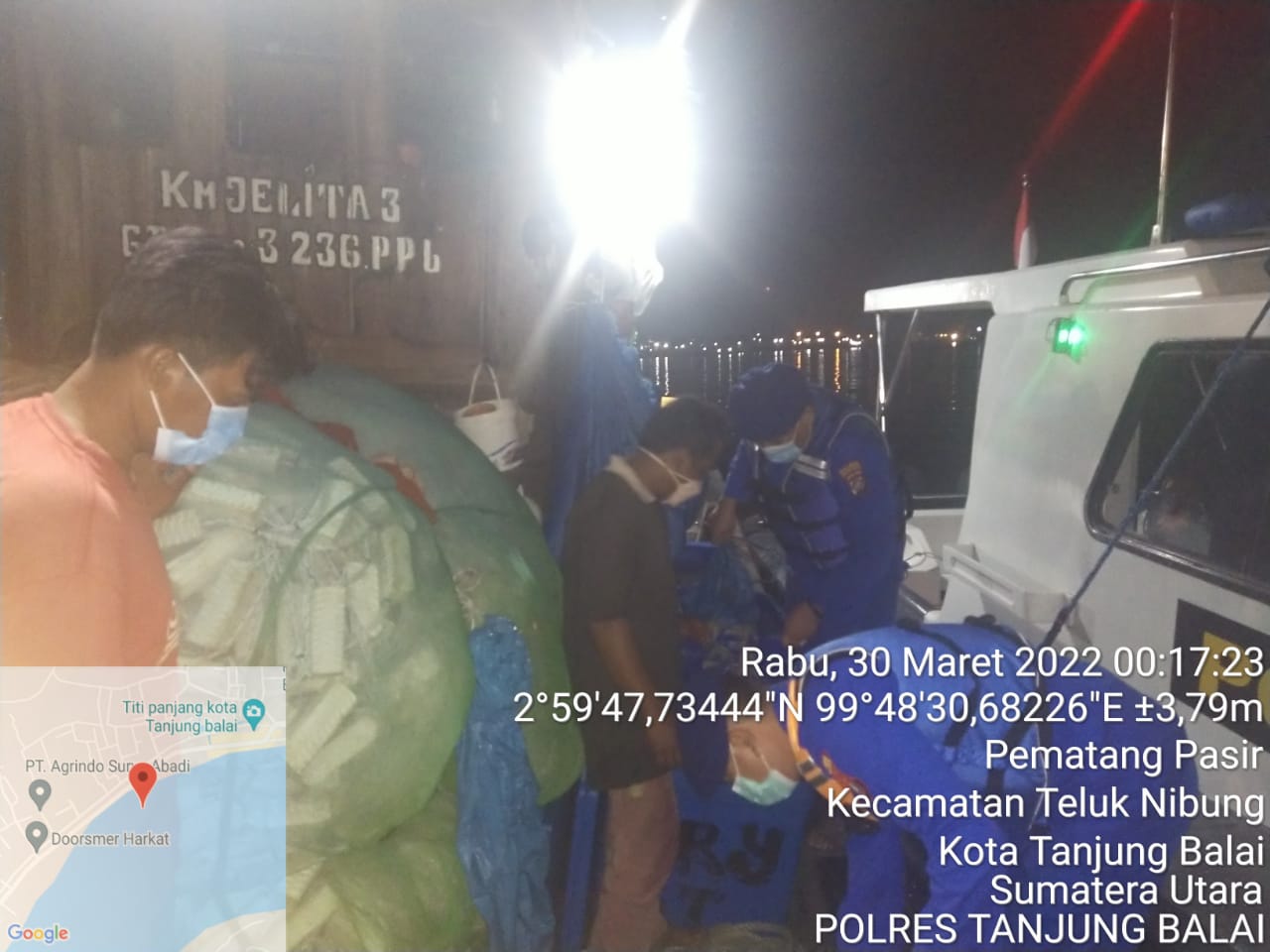 Kasatpol Airud, AKP T Sianturi juga menginformasikan, bahwa dalam patroli perairan yang dilaksanakan pada hari Selasa (29/3) itu pada pukul 00.17 WIB, Regu II yang diawaki oleh Bripka AS Damanik dan Bripka Juanda tersebut telah memberhentikan 1 (satu) kapal motor (KM) yang diduga membawa barang terlarang, datang dari arah laut dan memasuki perairan Tanjungbalai. Katanya, kapal motor yang di berhentikan tersebut bernama KM Jelita-3, GT.11 No.3236/ppb dengan awak kapal sebanyak 17 orang diberhentikan pada posisi/koordinat N : 2° 59′ 47.6736″, E : 99° 48′ 30.6032″.