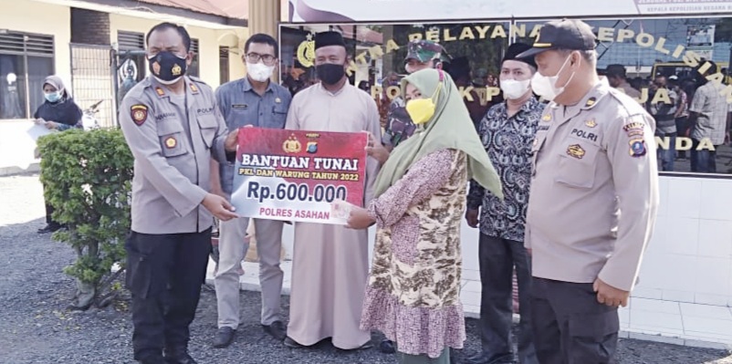 TASLABNEWS, ASAHAN – Kepolisian Resort (Polres) Asahan melaksanakan penyerahan bantuan tunai untuk pedagang kaki lima/warung di Kabupaten Asahan.