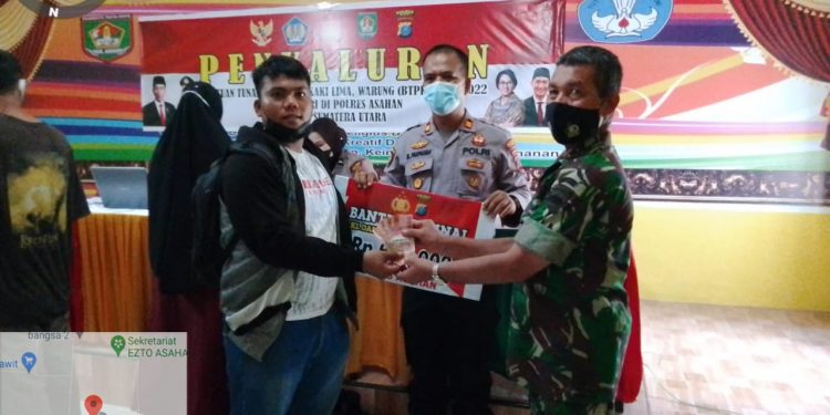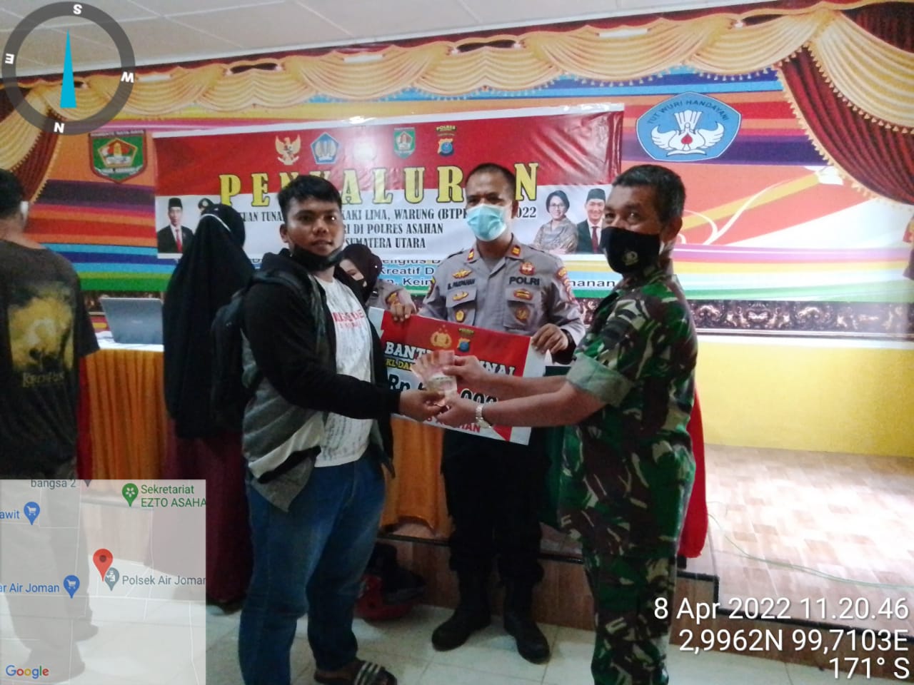 TASLABNEWS, ASAHAN- Polsek Air Joman Polres Asahan melaksanakan Penyaluran BTPKLW (Bantuan Tunai Pedagang Kaki Lima dan Warung) Tahun 2022 di Aula Korwil Dik Kecamatan Air Joman, Jumat (08/4/2022).