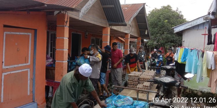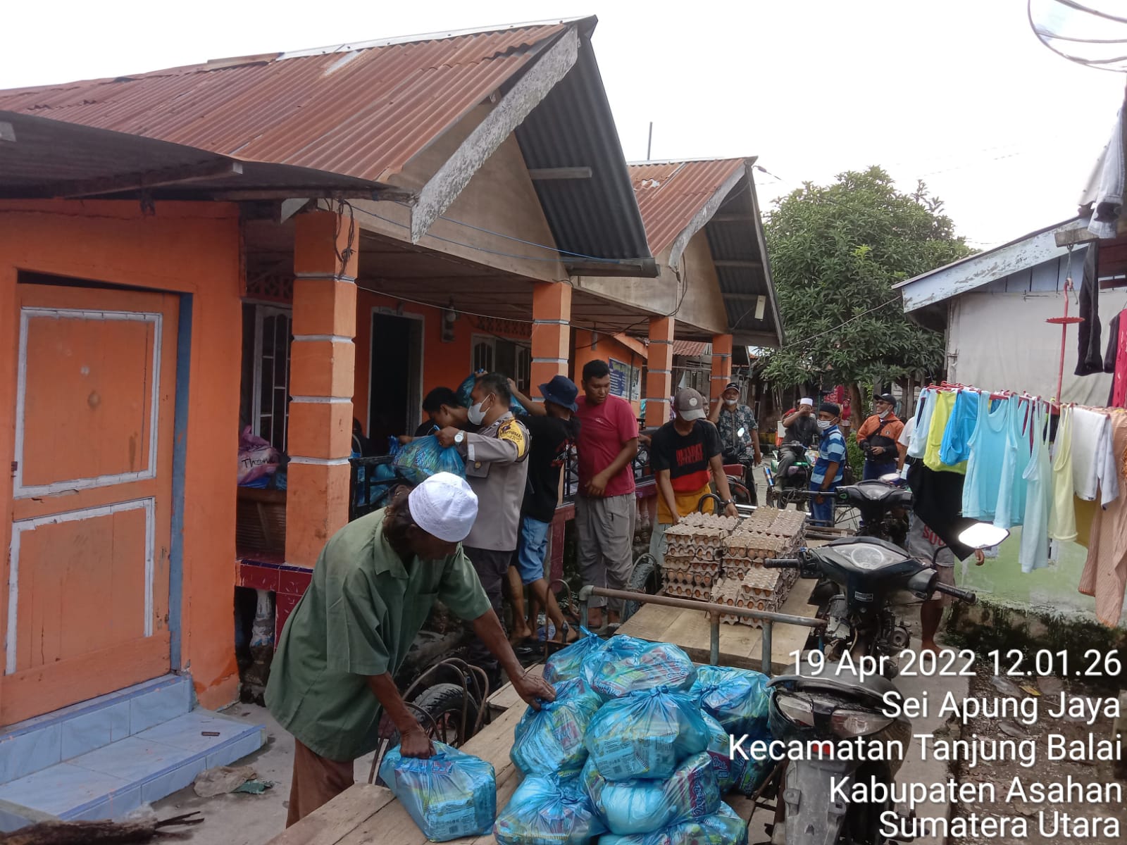 TASLABNEWS, ASAHAN- Polsek Sei Kepayang Polres Asahan melakukan pengawalan penyaluran bantuan sembako kepada korban musibah kebakaran di Posko kebakaran Desa Sai Apung Jaya Kecamatan Tanjung Balai Kabupaten Asahan, Selasa (19/4/2022).