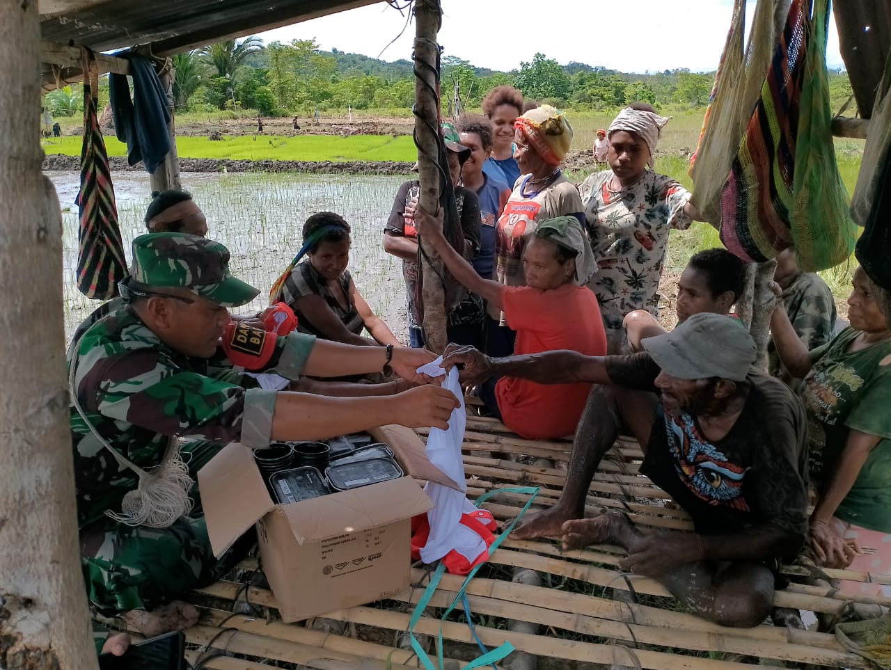 Disela-sela waktu istiraharat, Danpos Batom, Letda Inf Henri Capah juga membagikan para petani satu baju merah putih dan makanan TNI.