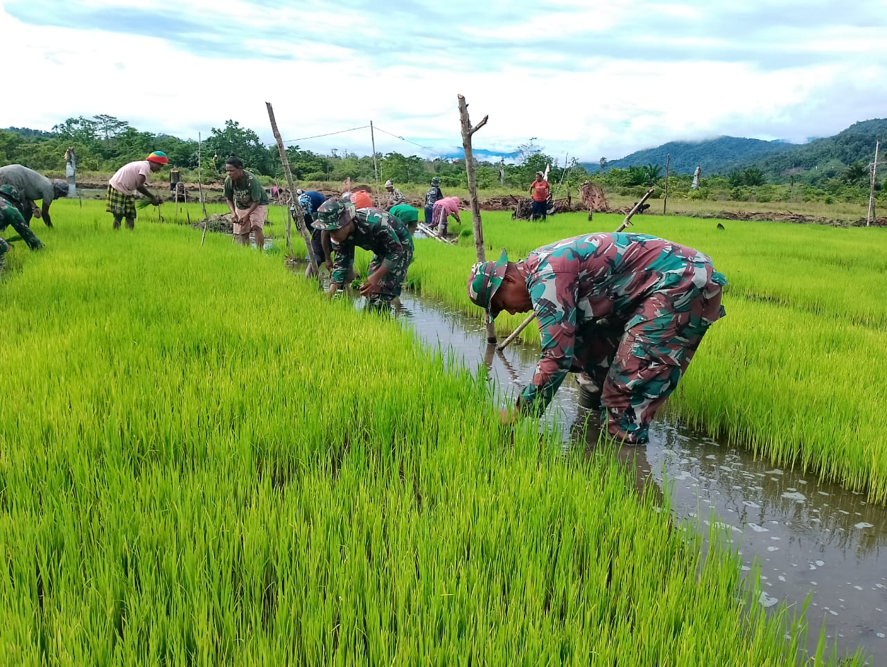 Satgas Yonif 126/KC Pos Batom membantu para petani menanam padi di Kampung Batom, Distrik Batom Kabupaten Pegunungan Bintang.