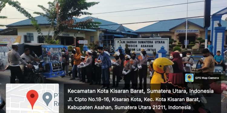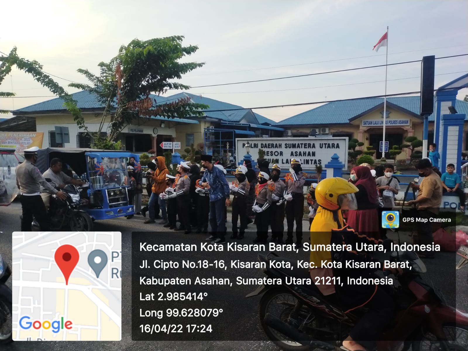 TASLABNEWS, ASAHAN- Satuan Lalu Lintas (Satlantas) Polres Asahan bersama Polisi Cilik Min 10 Asahan melaksanakan pembagian Takjil di depan Mako Sat Lantas Polres Asahan, Sabtu (16/4/2022).