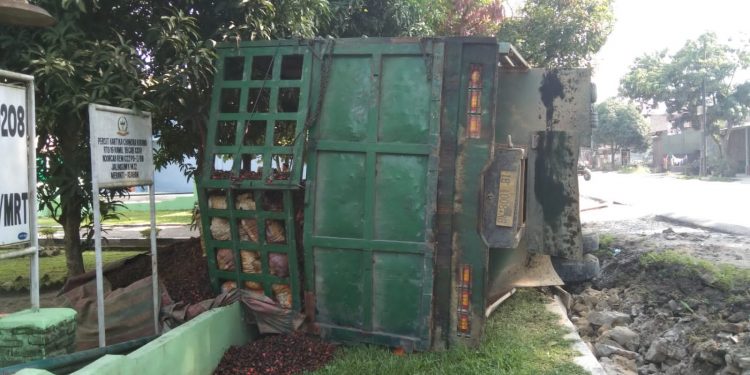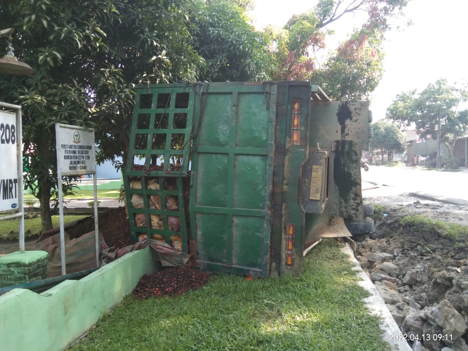 TASLABNEWS, ASAHAN- Diduga akibat rem blong, truk pengangkut sawit BK 8001 BI yang dikemudikan oleh M Arif (23) terbalik di depan Koramil 18 Meranti, tepatnya di Jalinsum Desa Sei Beluru, Kecamatan Meranti Kabupaten Asahan, Selasa (12/4/2022) sekira pukul 16.00 wib. M Arif diketahui merupakan warga Mahato Riau.