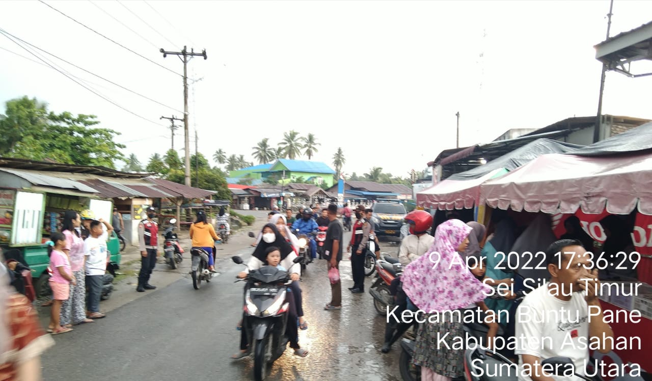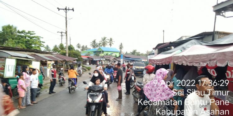 TASLABNEWS, ASAHAN – Personel Polsek Prapat Janji Polres Asahan mengatur arus lalulintas di lokasi penjual rakjil di bulan suci Ramadhan, Sabtu (04/4/2022).