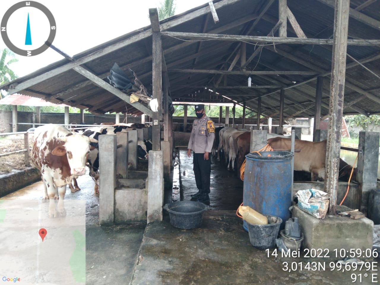 TASLABNEWS, ASAHAN-Bhabinkamtibmas Aiptu Mahmuddin melakukan pengecekan terhadap kandang ternak di Desa Punggulan Air Joman, Sabtu (14/5/2022).