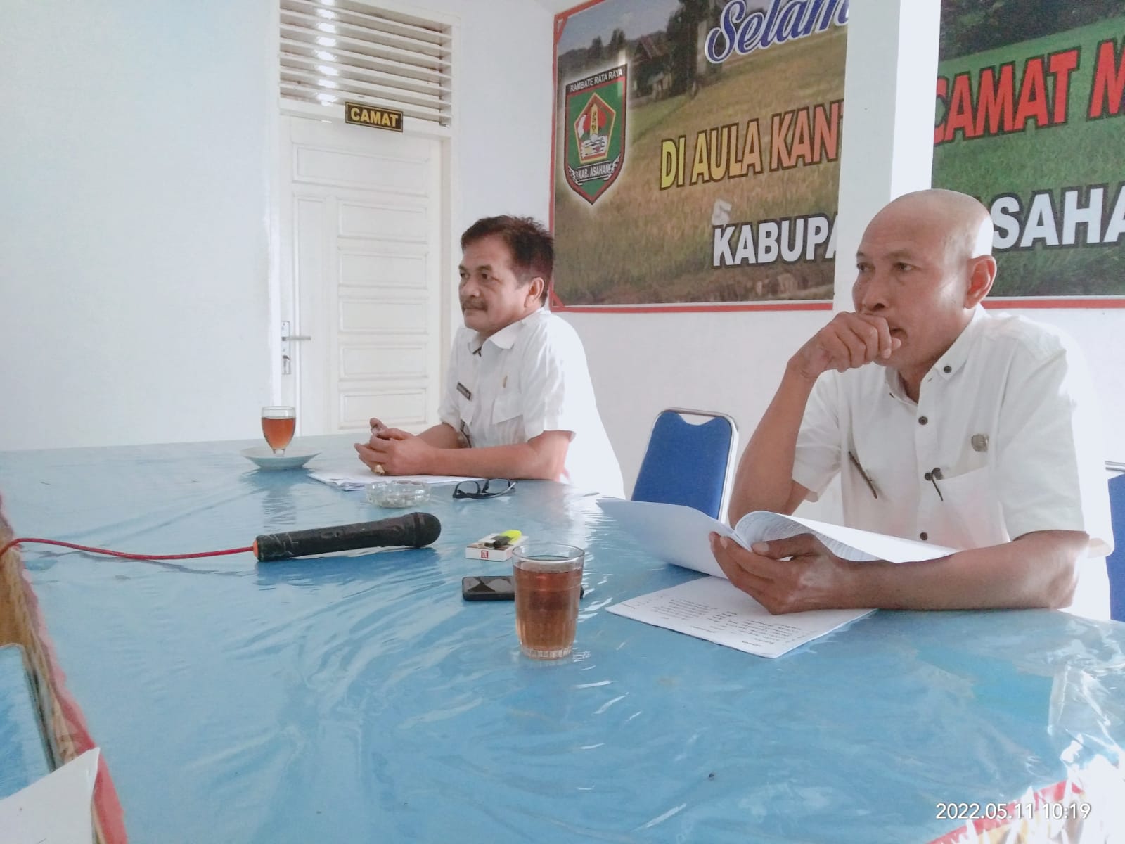Camat Meranti Sugeng Surya Saragih mengadakan sosialisasi persiapan pemilihan kepala desa dengan panitia Pilkades, Rabu (11/05/2022) sekira pukul 10.00 wib di aula kantor Camat Meranti.