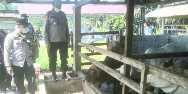 Mencegah merebaknya PMK pada ternak sapi di Batubara, Kasat Binmas Polres Batubara secara langsung menyambangi para peternak di Desa Empat Negeri, Jumat (13/05/2022).