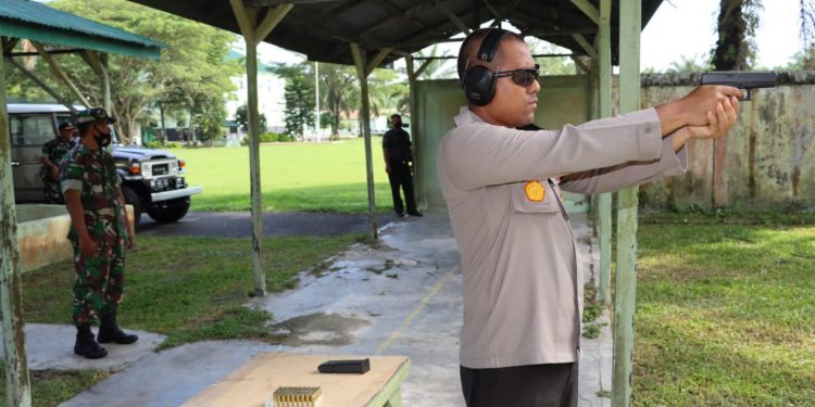 TASLABNEWS, ASAHAN- Kapolres Asahan AKBP Putu Yudha Prawira SIK MH bersama Dandim 0208/AS Letkol Inf Franki Susanto SE melakukan latihan menembak di lapangan tembak Makodim 0208/AS Jalan Jenderal Sudirman Kisaran, Rabu (18/5/2022).