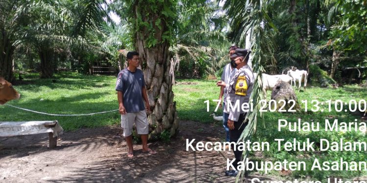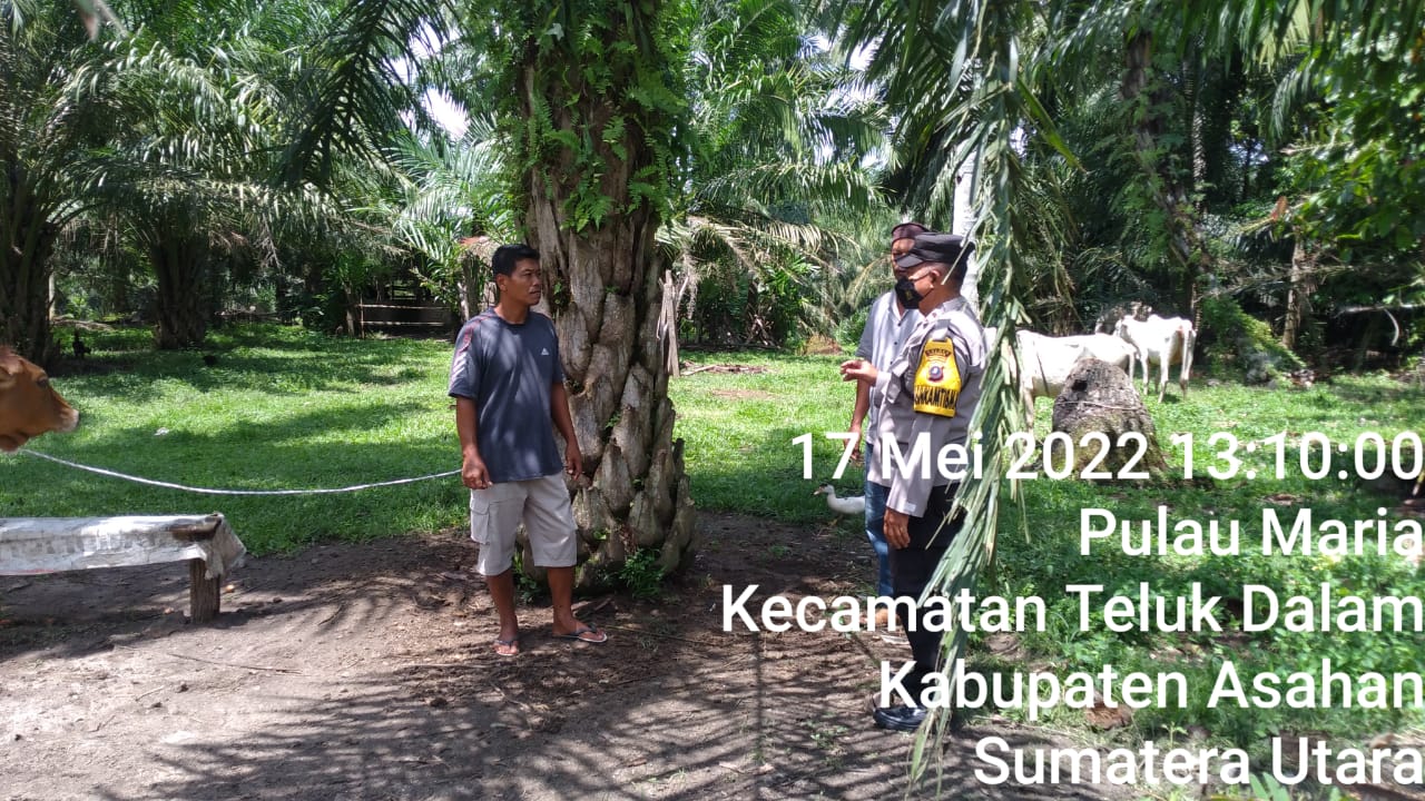 Pada kegiatan Bhabinkamtimas Aiptu Ishak menyambangi Kandang Ternak Lembu Bapak Wiwik Sandi Dsn I Desa Pulau Maria, Kec. Teluk Dalam, Kab. Asahan.
