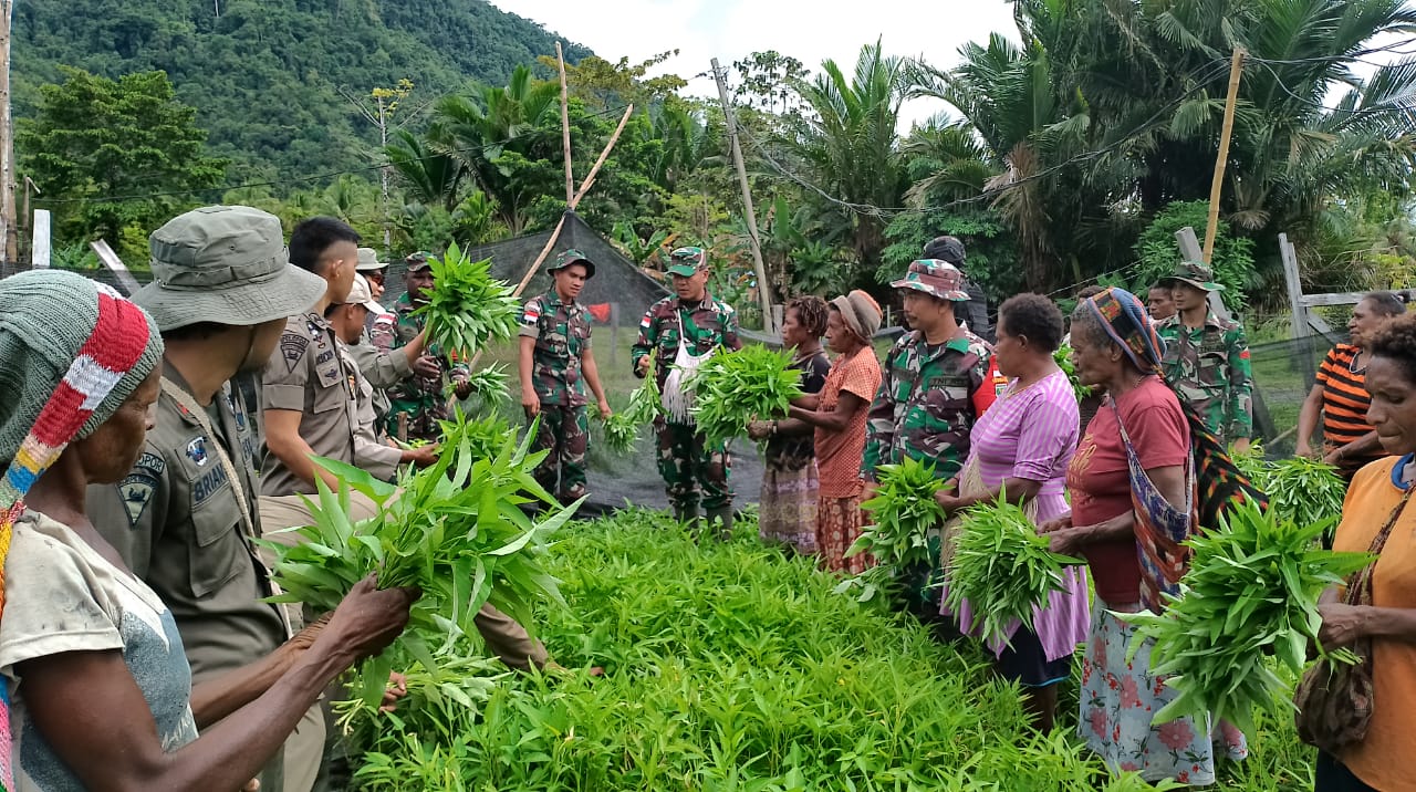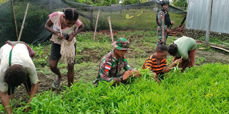 TASLABNEWS, PAPUA – Anggota Satgas Pamtas RI-PNG Yonif 126/KC Pos Batom membantu panen Kangkung milik warga Kampung Batom, Distrik Batom, Kabupaten Pegunungan Bintang, Papua.
