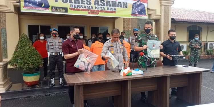 TASLABNEWS, ASAHAN-Didampingi Dandim 0208 Asahan, Kapolres Asahan mengadakan pres rilis penangkapan dan pemberantasan judi tembak ikan/gamezone di wilayah hukumnya, Jumat (22/07/2022) sekira pukul 10.30 wib di halaman Polres Asahan.