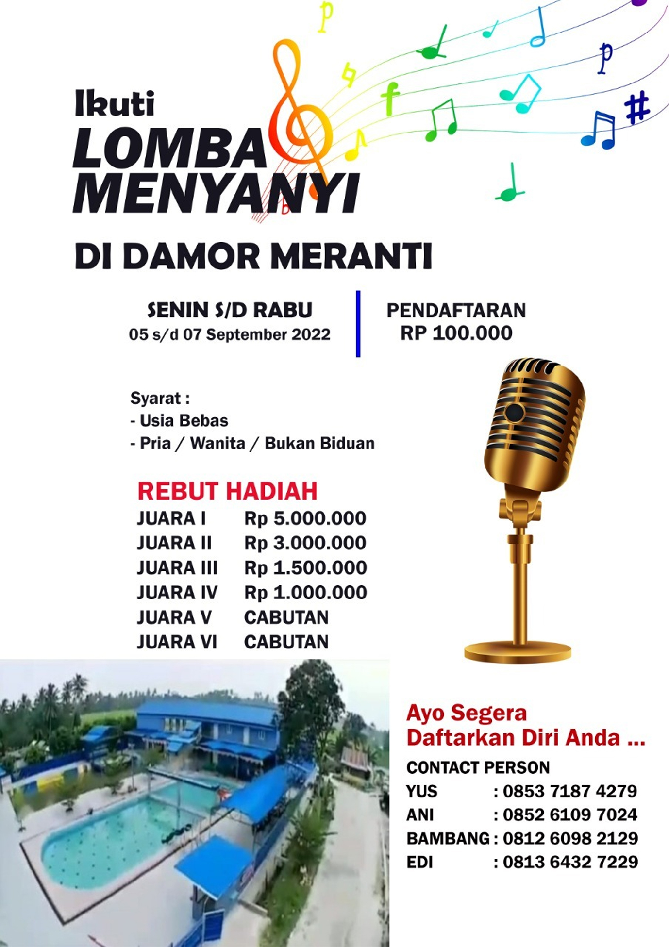TASLABNEWS, ASAHAN – Sebagai lanjutan meriahkan HUT Kemerdekaan RI ke-77, tempat wisata keluarga Damor Meranti menggelar lomba bernyanyi dengan memperebutkan hadiah hingga Jutaan Rupiah.