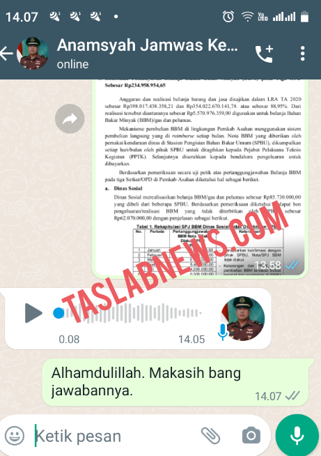Terpisah, Sekjen DPP Bara Api Afifuddin mengatakan salut dengan Jamwas Kejagung yang sudah menerima konfirmasi dari wartawan terkait kasus pemalsuan dokumen/nota pembelian BBM di Dinsos, Dinas Lingkungan Hidup dan Setdakab Asahan.