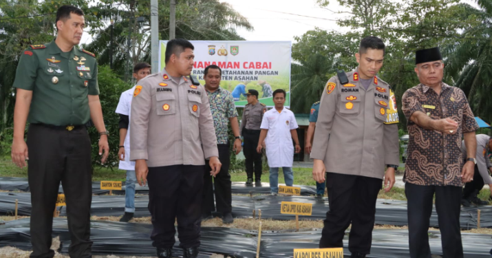 TASLABNEWS, ASAHAN-Setelah menerima bantuan sebanyak 5 ribu bibit pohon cabai, Kapolres Asahan AKBP Roman Smaradhana Elhaj SH SIK MH bersama Forkopimda Asahan melaksanakan penanaman bibit cabai di Polsek Kota Kisaran, Kamis (15/9/2022).