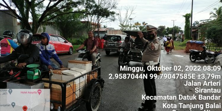 TASLABNEWS, TANJUNGBALAI – Sejumlah personil dari Satuan Lalu Lintas (Satlantas) Polres Tanjungbalai melaksanakan pengamanan dan pengaturan arus lalu lintas pada saat berlangsungnya pawai perayaan Jubileum 75 Tahun Gereja Katolik Santo Mikael di Kota Tanjungbalai.