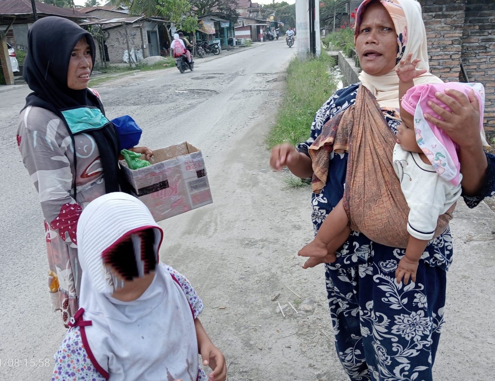Adalah Santi (45) dan Sida (47) kedua emak-emak yang keliling Desa Meranti dengan membawa dua orang anak, untuk meminta bantuan dari warga, Selasa (8/11/2022) sekira pukul 15.30 wib.