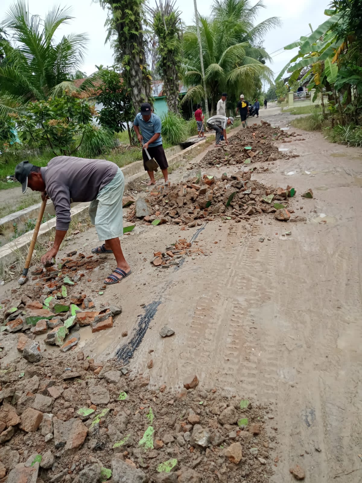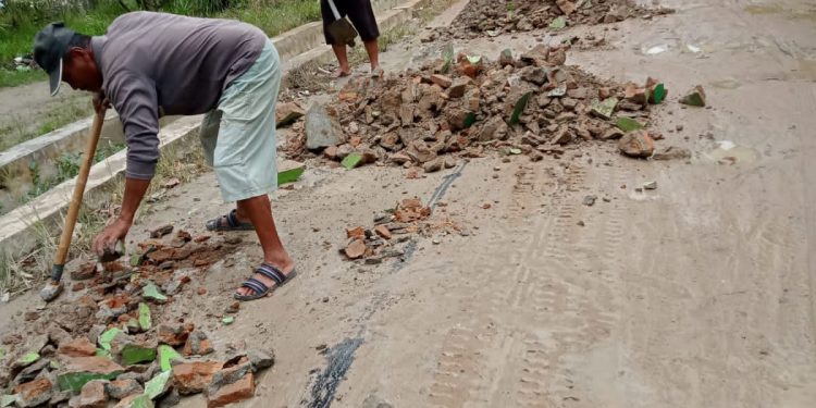 Dari keterangan Kepala Dusun 2 Mulyadi, warga sudah tidak sabar menunggu perbaikan jalan, sehingga inisiatif menimbun jalan yang berlubang dan rusak dengan batu bongkaran bangunan.