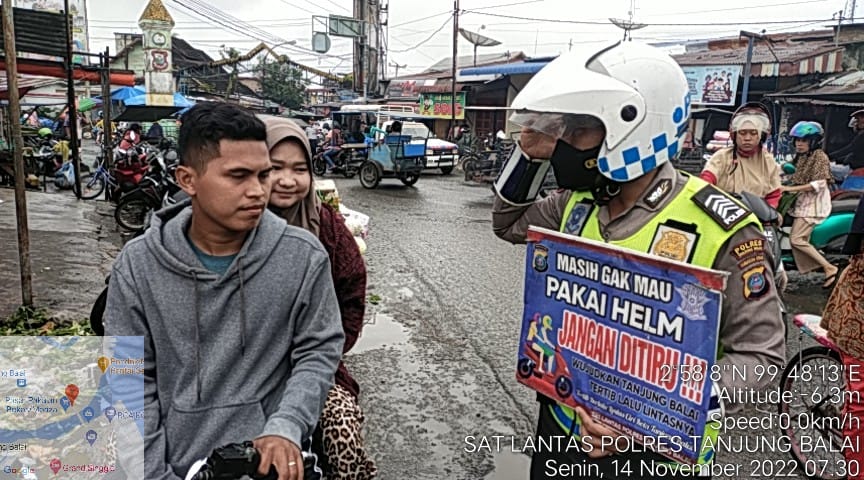 Personil Satuan Polisi Lalulintas (Satlantas) Polres Tanjungbalai, Senin (14/11) mulai dari pukul 08.00 WIB sampai selesai, kembali laksanakan kegiatan rutin berupa memberikan imbauan kepada masyarakat Kota Tanjungbalai agar menggunakan helm Standart Nasional Indonesia (SNI) saat berkendaraan menggunakan sepedamotor.
