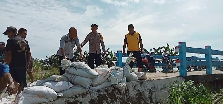 Sekcam Meranti Sudarman, Kaposiyan Meranti Aiptu islamuddin, Babinkantimas Aipda Doan S melakukan aksi membuat benteng untuk menahan luapan air.