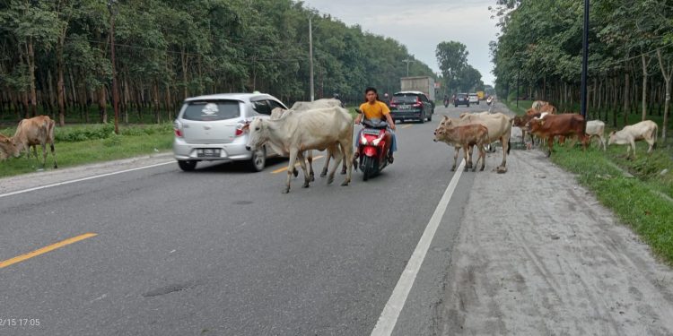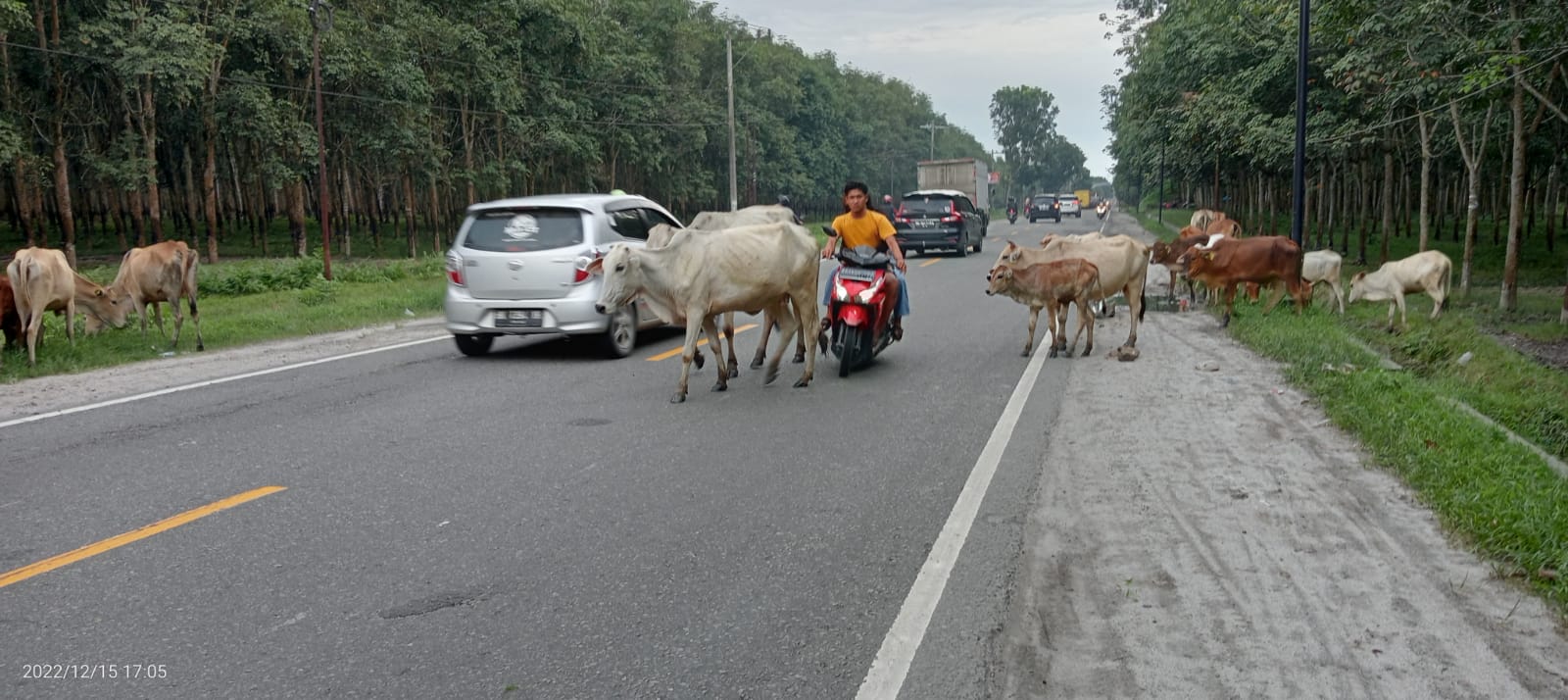 Pantauan wartawan, Kamis (15/12/2022) sekira pukul 17.00 wib, ternak lembu yang berkeliaran di jalinsum dikeluhkan warga.