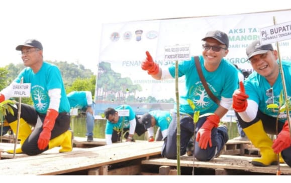 Wakil Presiden Direktur PTAR bersama Direktur PPKPL, serta Pj. Bupati Tapanuli Tengah, saat menanam bibit mangrove di aksi tanam mangrove, Kamis (2/2/2022).