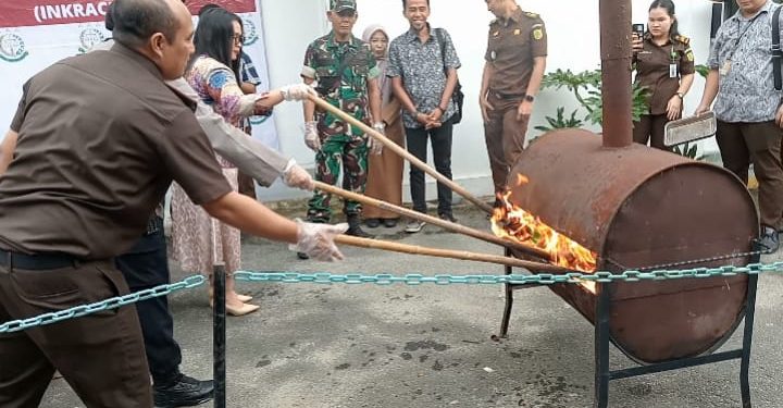 TASLABNEWS, ASAHAN-Kejari melakukan pemusnahan barang bukti dari 114 kasus priode 1 Desember 2022 sampai 15 Maret 2023. Kegiatan dilaksanakan, Selasa (21/3/2023) sekira pukul 20.00 WIB di halaman kantor Kejari Asahan.