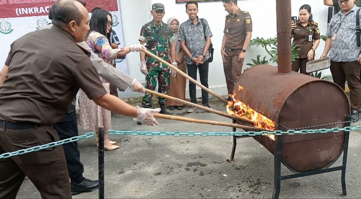 Adapun barang bukti yang di musnakan perkara narkoba, sabu seberat 3.615.77 gram, ganja 50.22 gram, Extacy 381.86 gram, bong 4, timbangan 9 unit, pipet skop 32, mancis 4, kaca pireks 7, kotak rokok 11.