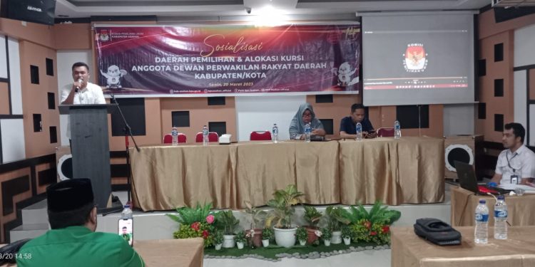 TASLABNEWS, ASAHAN-Komisi Pemilihan Umum (KPU) Kabupaten Asahan mengadakan sosialisasi daerah pemilihan dan slokasi kursi anggota Dewan Perwakilan Rakyat Daerah kabupaten/kota, Senin (20/3/2023) sekira pukul 14.00 WIB di hotel Antares, Kisaran Barat, Kabupaten Asahan, Sumatera Utara.