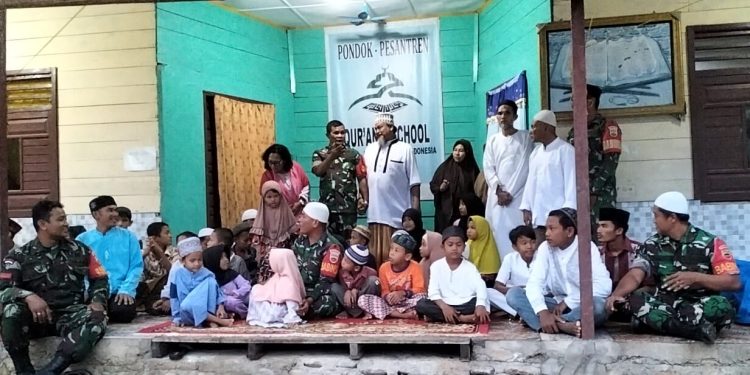 Plh Danramil 05/Kolang, Letda Inf Beringin Limbong bersama Ketua Ranting Persit KCK dan Babinsa serta Pengurus Pondok Pesantren Qur’anic School berbuka puasa bersama di Desa Tapian Nauli I, Kabupaten Tapteng.