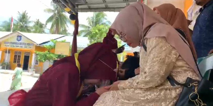Selanjutnya acara di lanjutkan dengan memangil satu persatu siswa yang akan dilepas untuk menerima mendali Almamater dan Rapot,di lanjutkan dengan setiap siswa sembah sujud kepada orang tua masing masing. (Edi/Syaf)