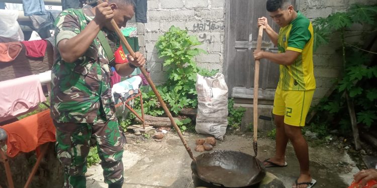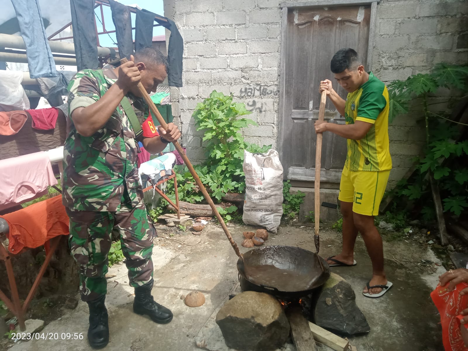 Babinsa Koramil 06/Kota, Serda Hilman Purba membantu warga membuat kue dodol di Kelurahan Pancuran Kerambil, Kota Sibolga.