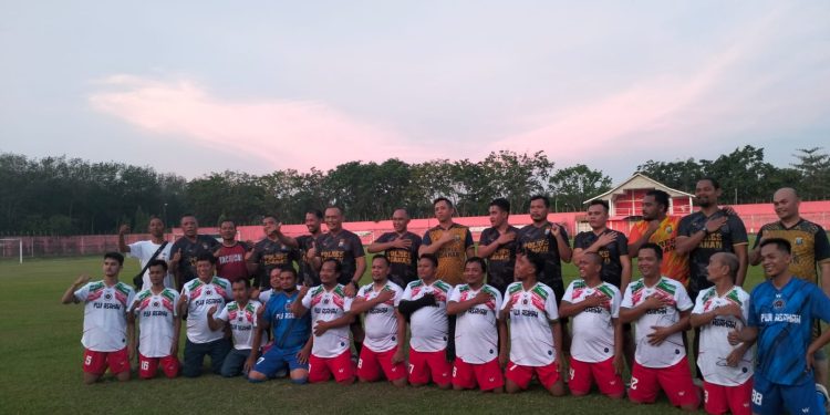 TASLABNEWS, ASAHAN – Kapolres Asahan AKBP Rocky Hasuhunan Marpaung menyentak 2 gol dalam pertandingan persahabatan antara tim sepak bola Polres Asahan melawan tim sepak bola wartawan FC yang di menangkan oleh Polres Asahan dengan skor 3-0 di Stadion Mutiara Kisaran, Kamis (11/05/2023) sekira pukul 17.00 WIB.