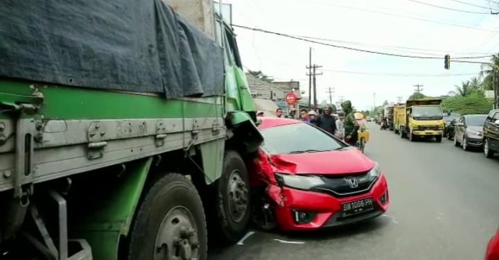 Setiba di tempat kejadian, truk menabrak mobil penumpang KIA pregio BK-1966-VJ yang dikemudikan oleh Yadi Sumarsin (43) warga Dusun X, Desa Terusan Tengah, Kecamatan Tinggi Raja, Kabupaten Asahan.